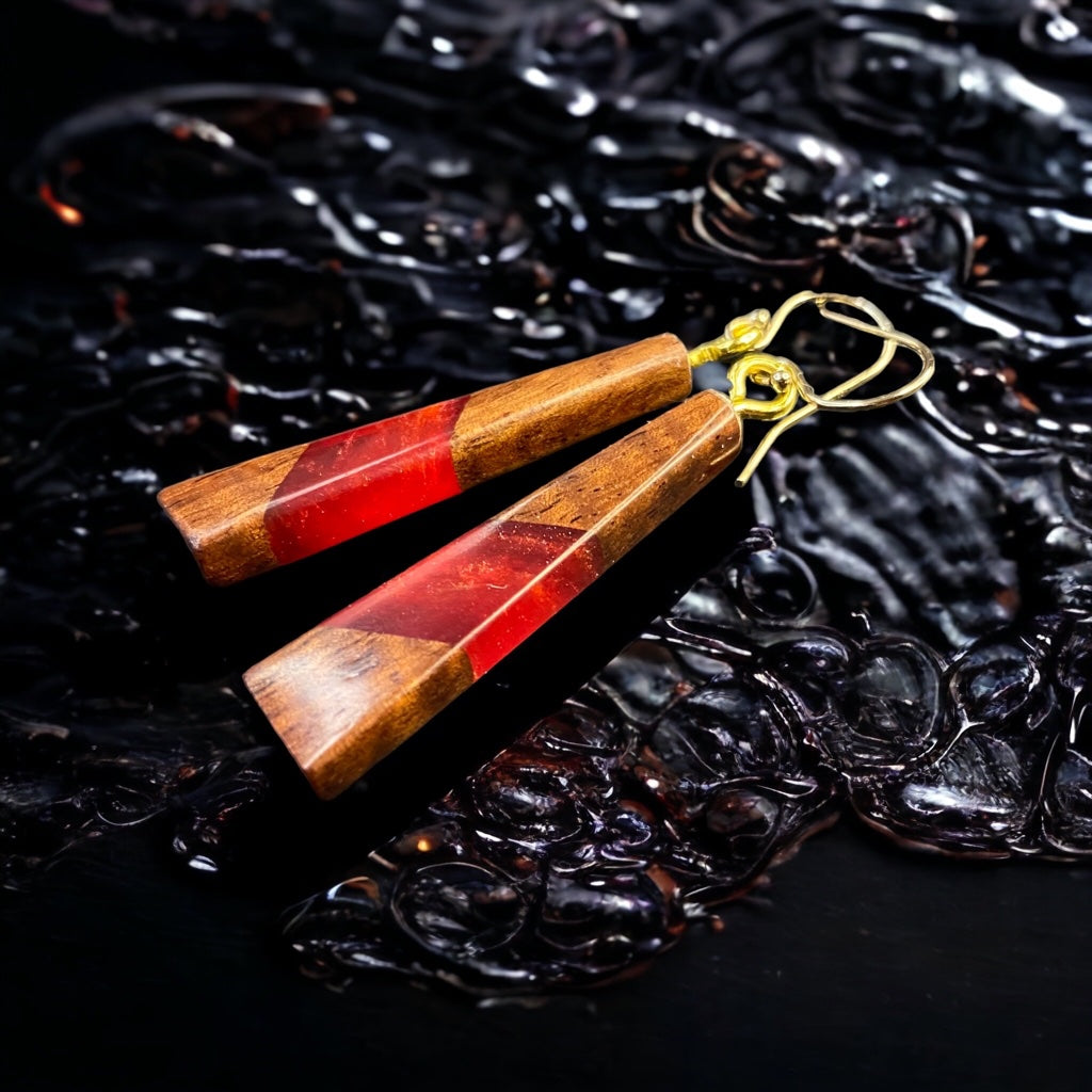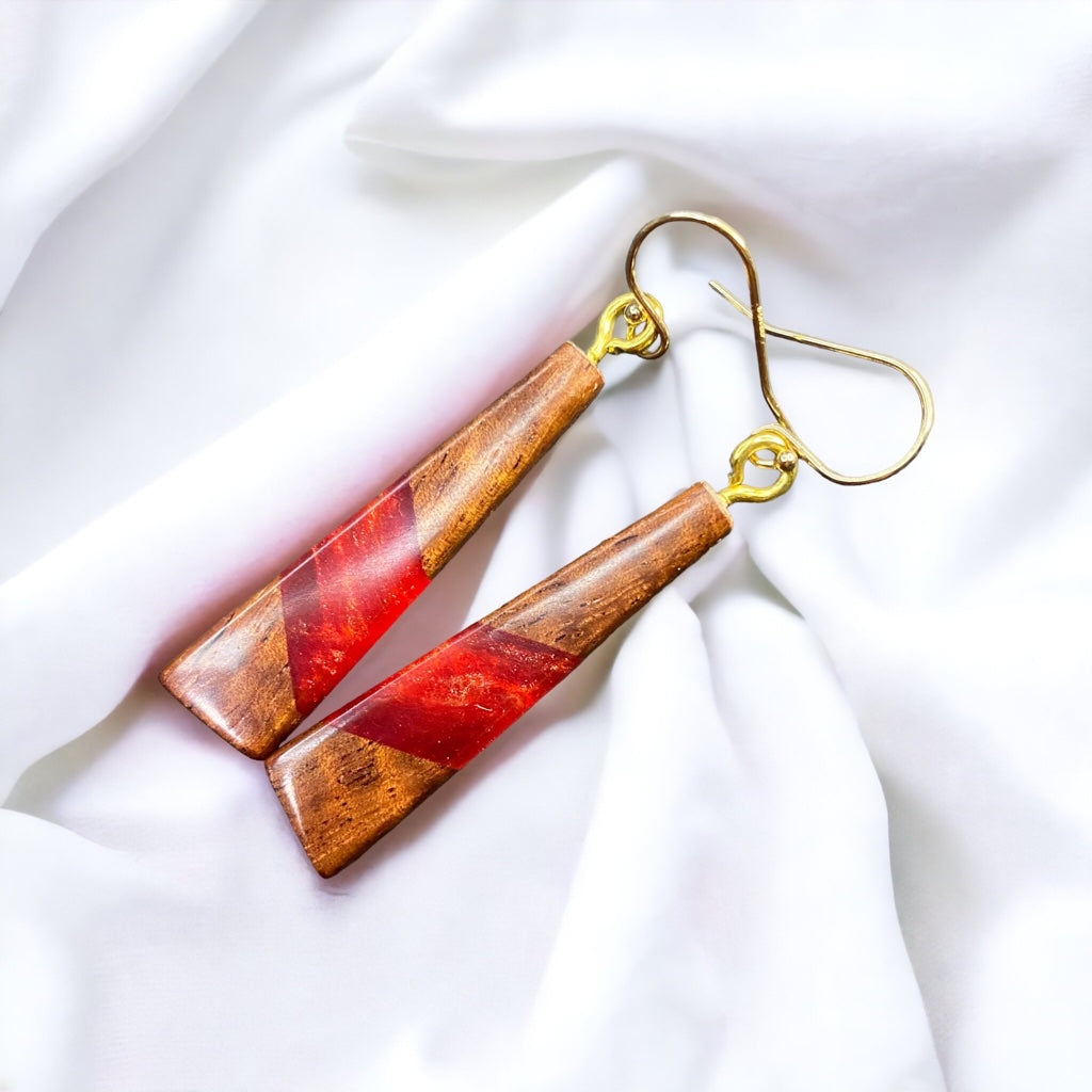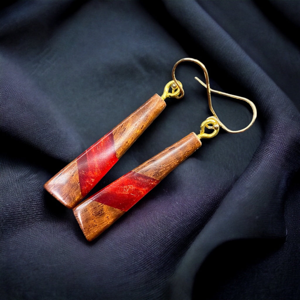 A similar design to the Honuamea design, a red colored resin representing the fiery earth of Pele. This collection is a shorter set of earrings designated to be worn on an everyday basis for that daily glamour. These earrings measure approximately 1.5" to 2" from the base of the earlobe. All pieces in this collection are similar in color and cut, however, each piece is handmade and can differ slightly from what is pictured.