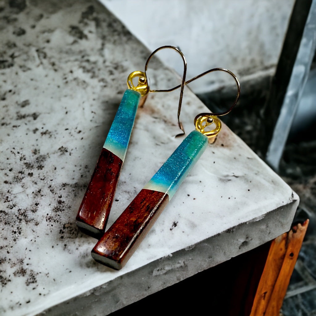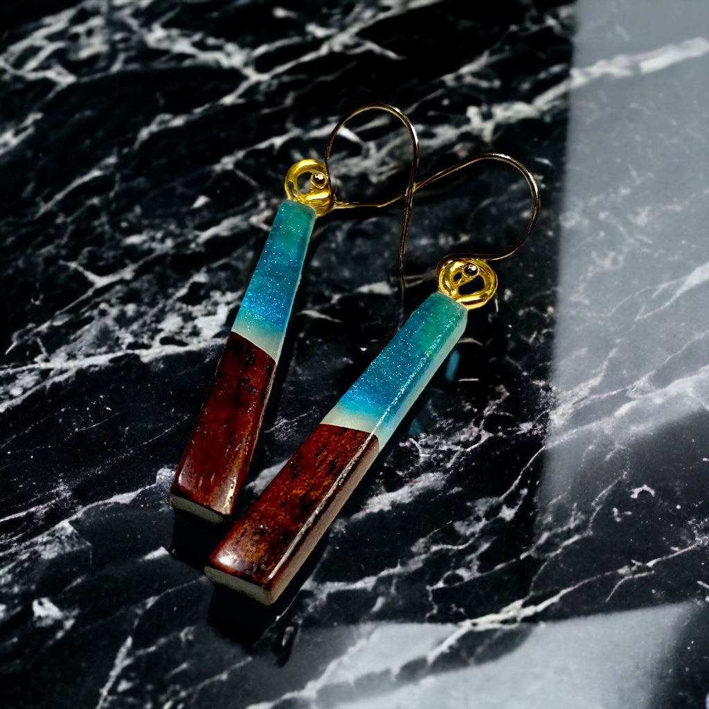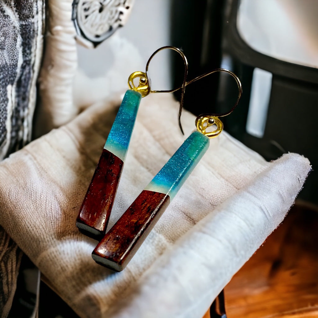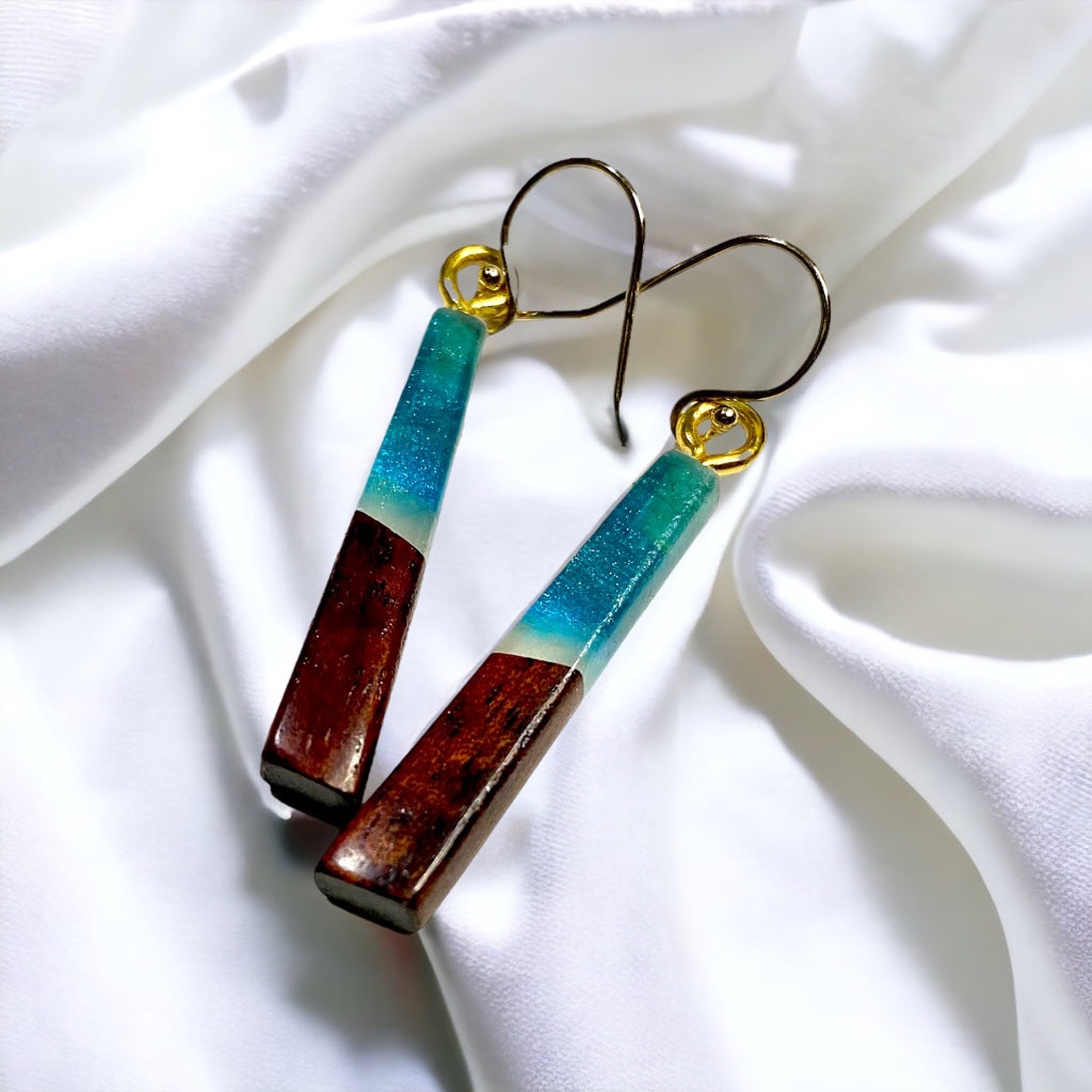 Earrings are made with Koa wood and colored resin