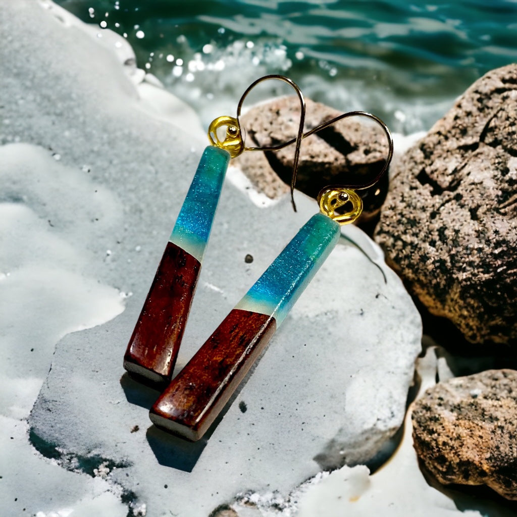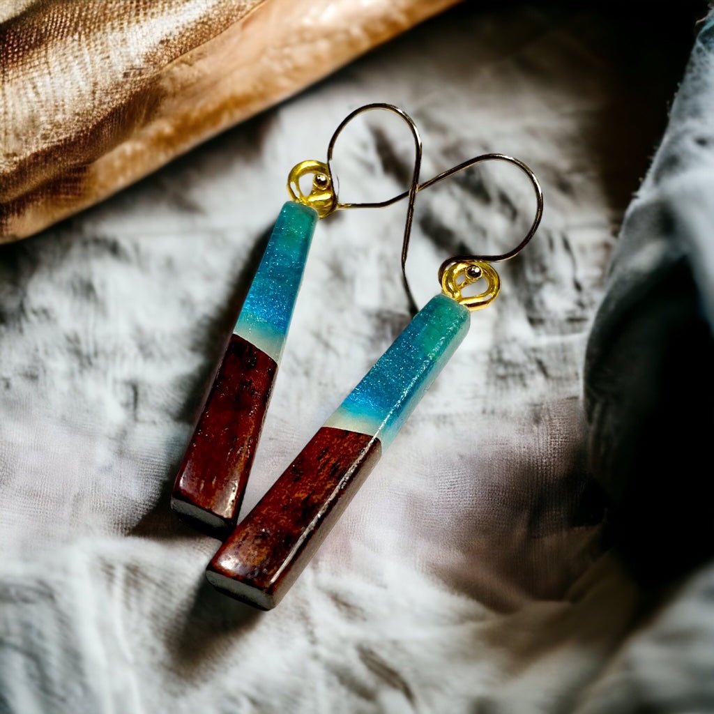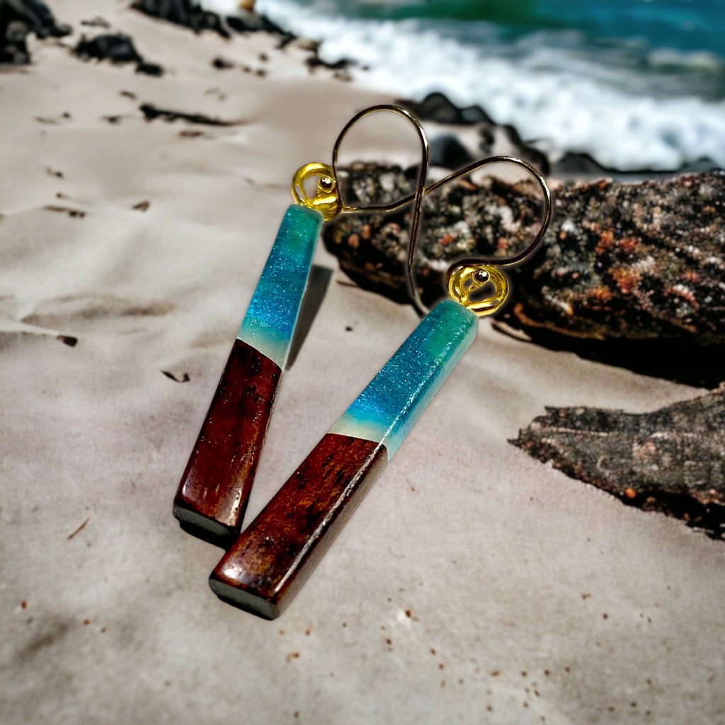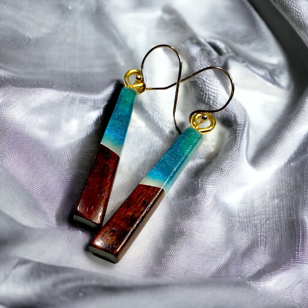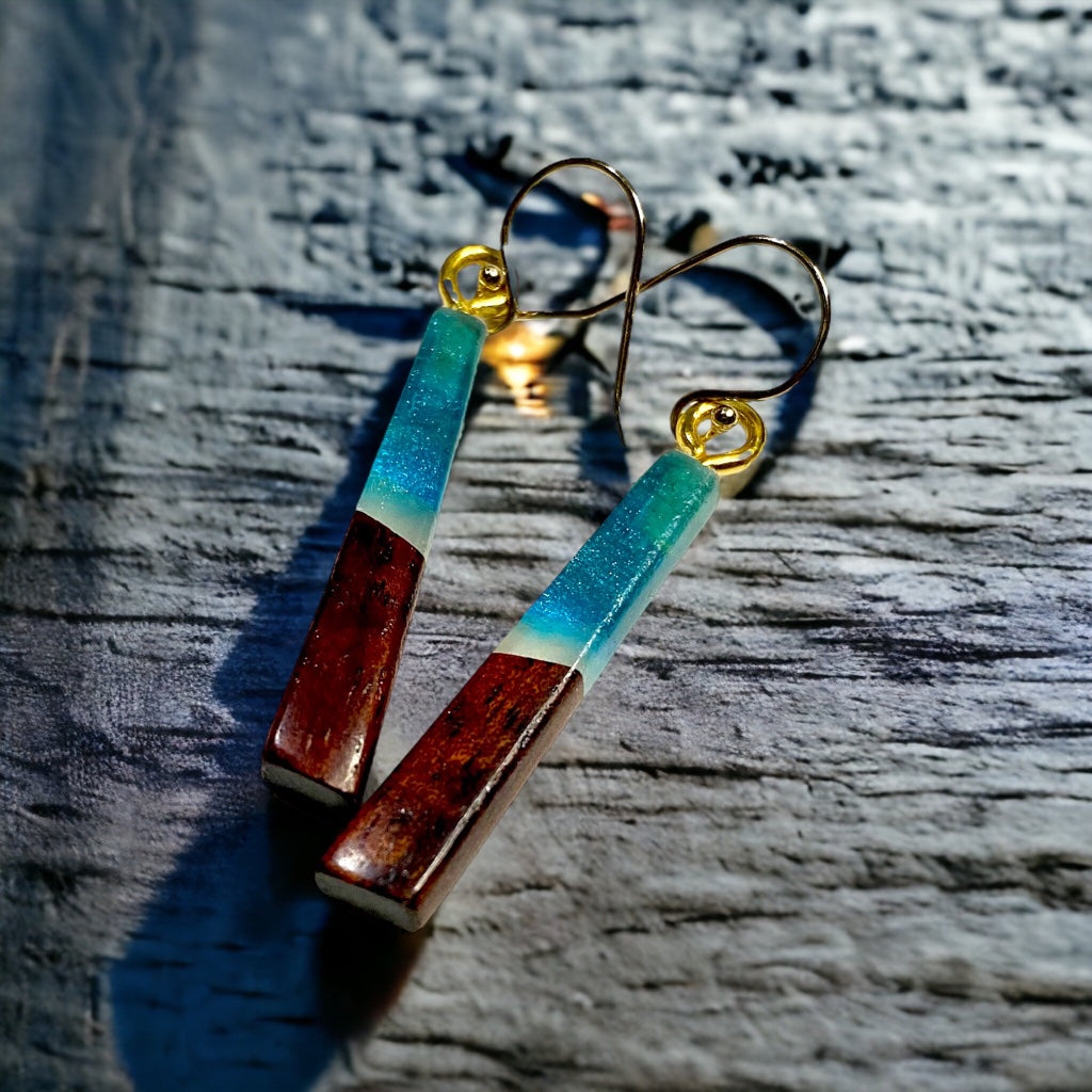 Earrings are made with Koa wood and colored resin
