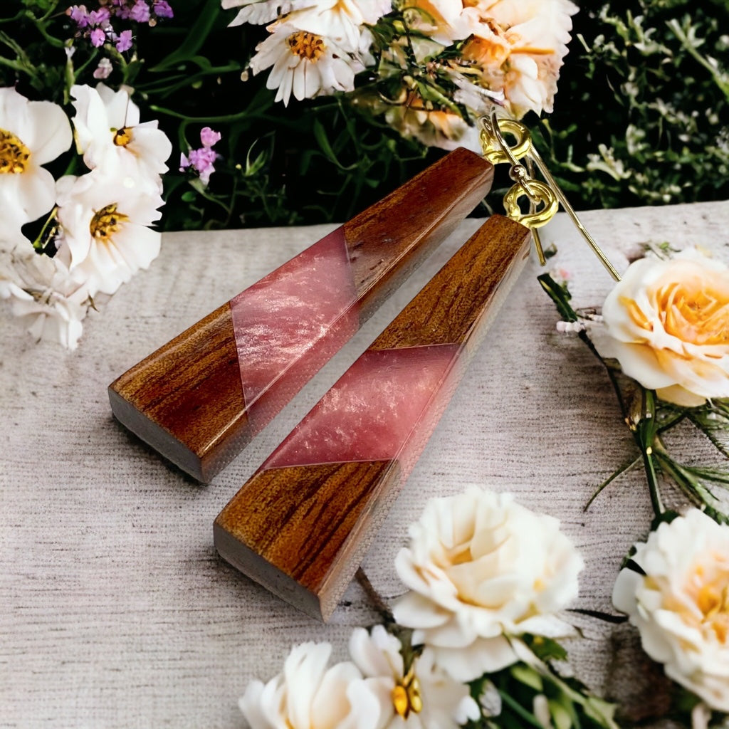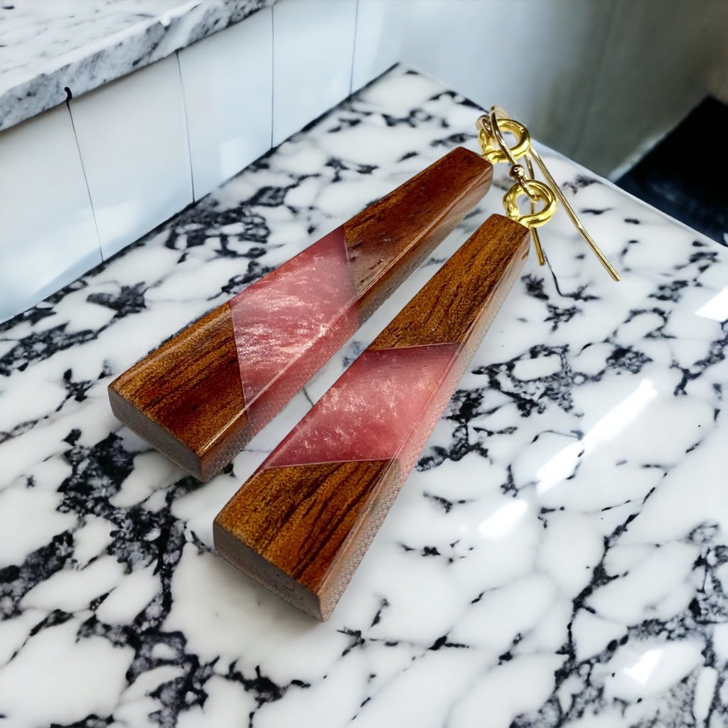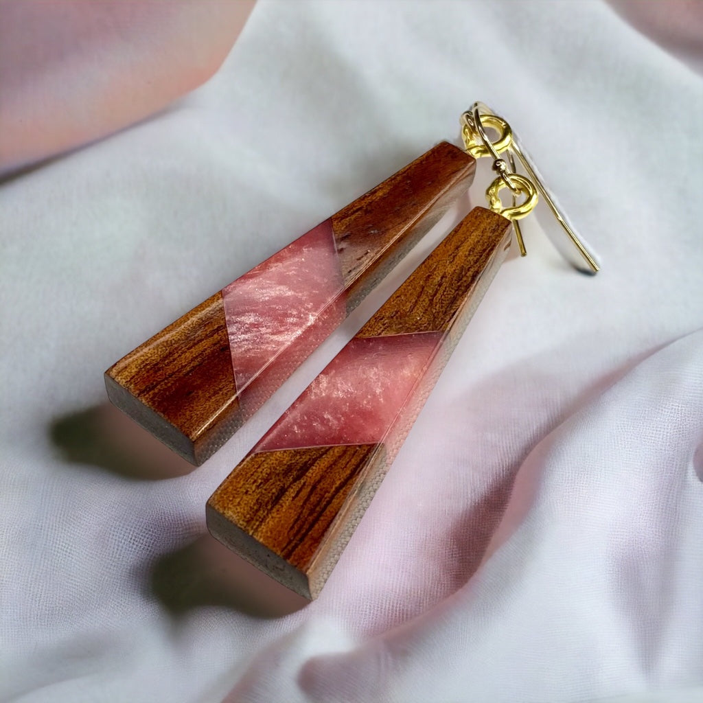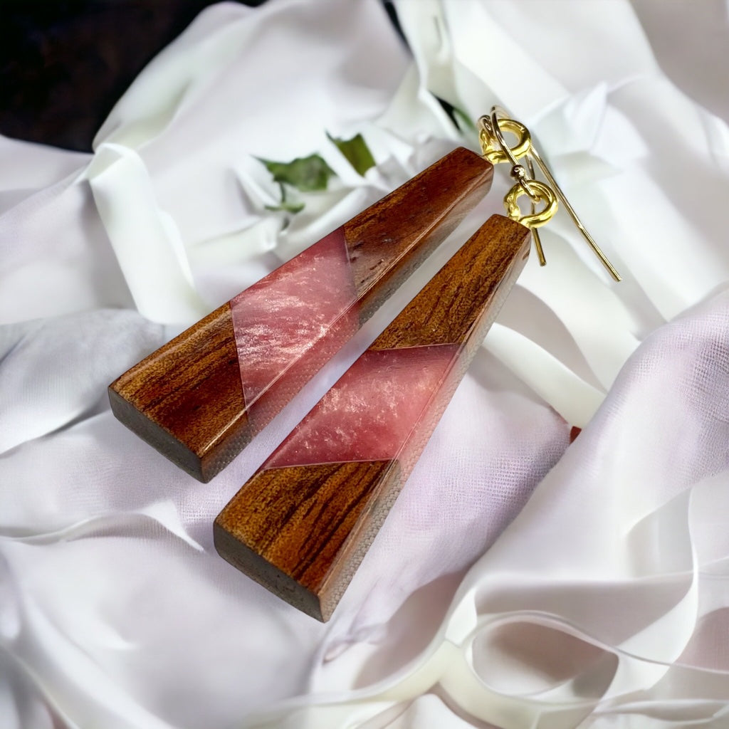 Earrings are made with Koa wood and colored resin