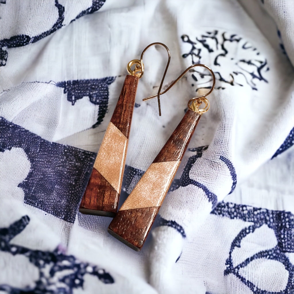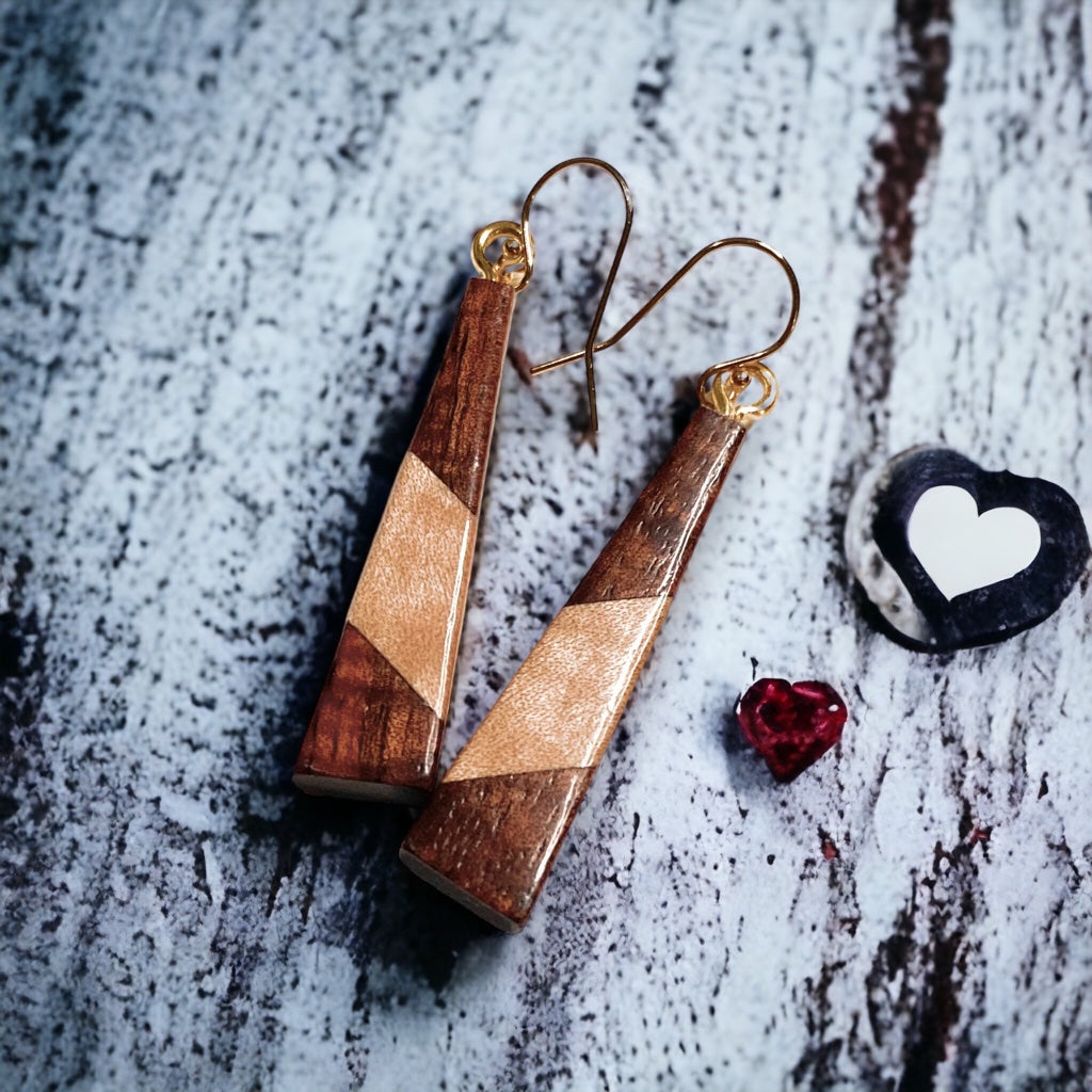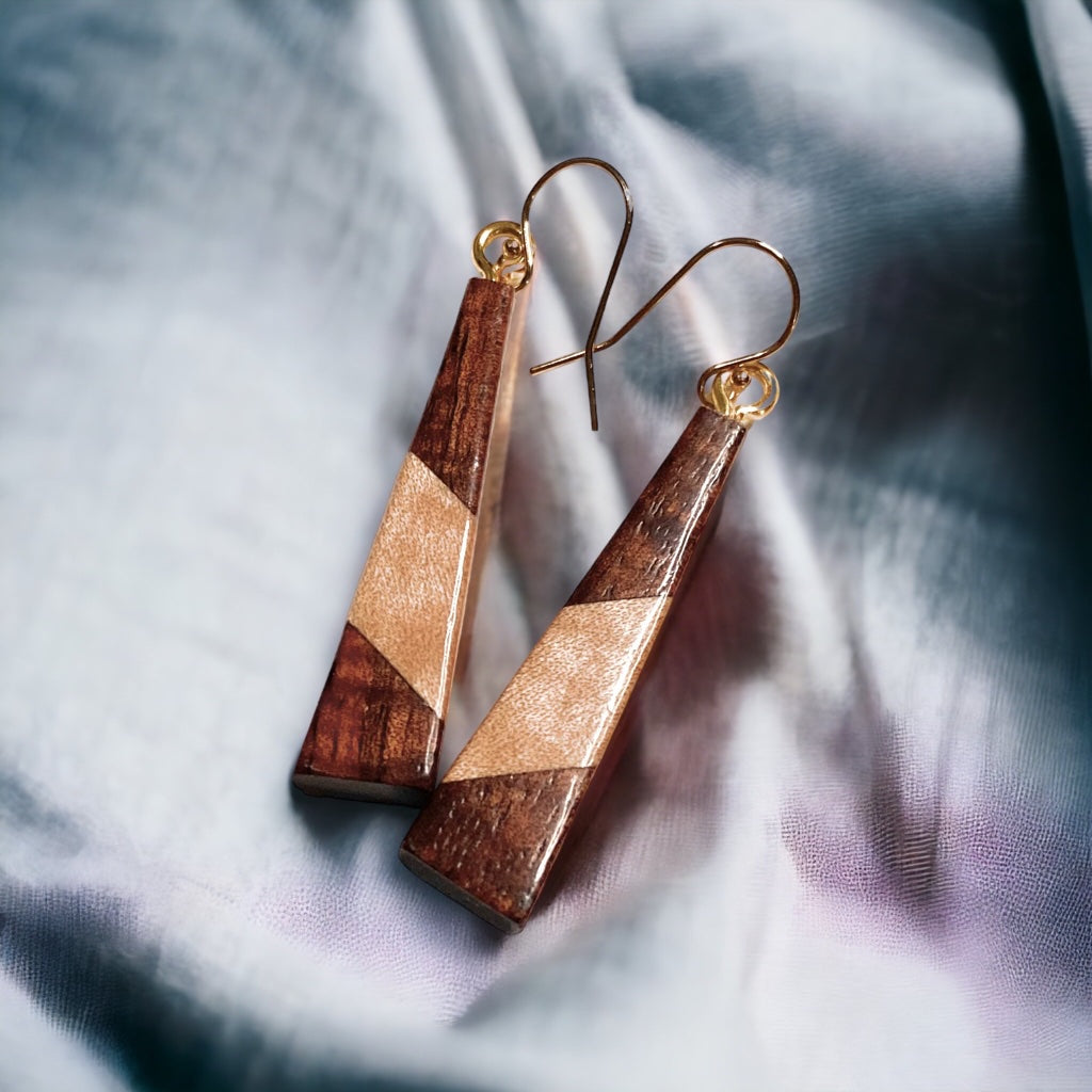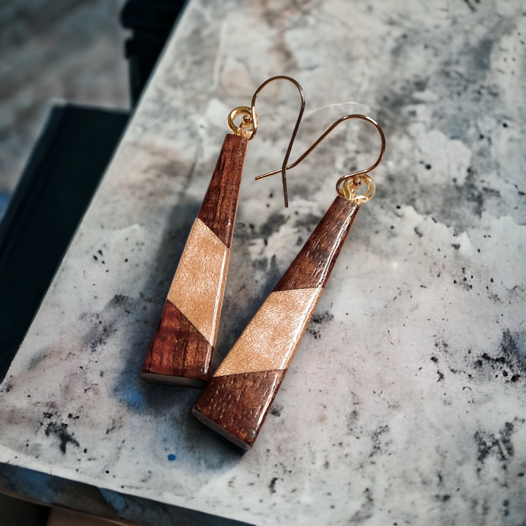 Earrings are made with Koa wood with Bridseye Maple or Masur Birch as the contrasting colored wood