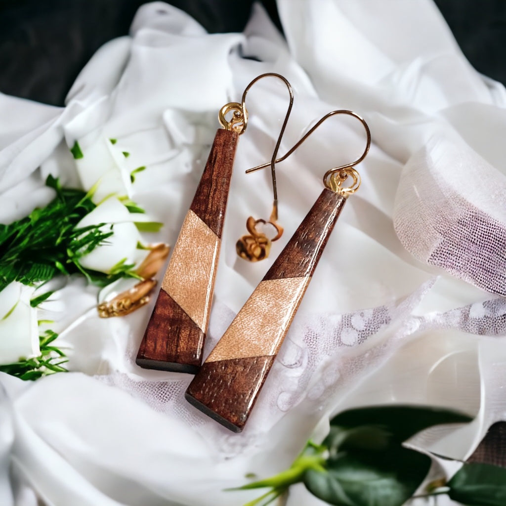 My original design, named for my hiapo (first born child) Kūpono. This is the design that started it all. This one is called Pono. I was always taught that the true meaning of pono meant balance. Hawaiians never believed in being right, they believed that when things were in balance, things were in harmony. From sadness emerges joy. From happiness comes devotion. From loss, new birth emerges. From weakness, we discover strength. The design of pono has a slight angle, which should be pointed towards your body to bring mana into your heart. These earrings are to bring inner resilience and balance to your life. The combination of two woods that compliment each other, our pono design is a beautiful, bold wearable masterpiece that strengthens your heart. These earrings measure approximately 1.5" to 2" from the base of the earlobe.