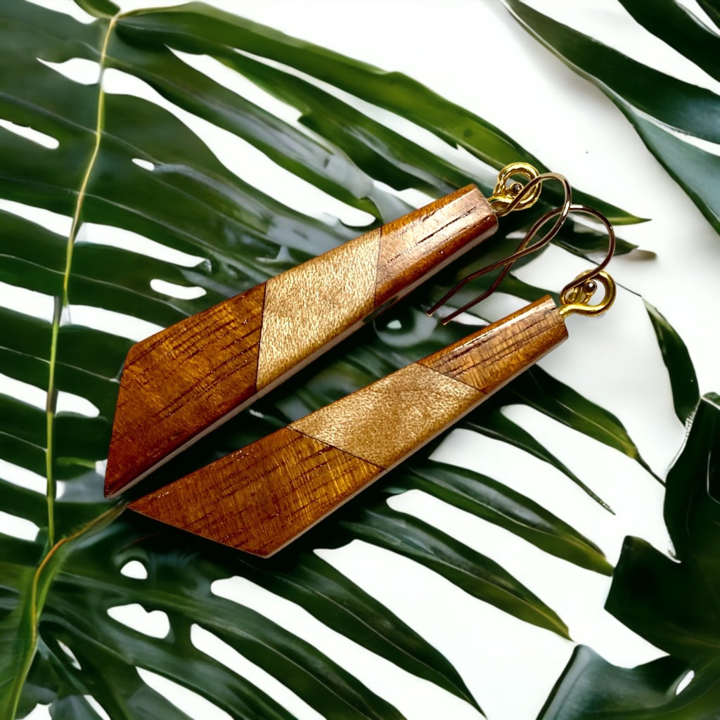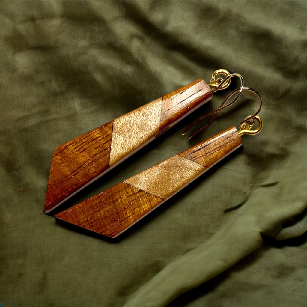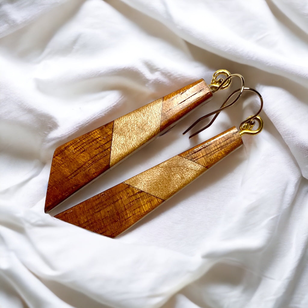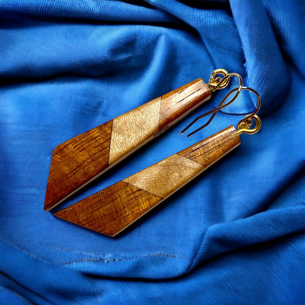 Earrings are made with Koa wood with Bridseye Maple or Masur Birch as the contrasting colored wood
