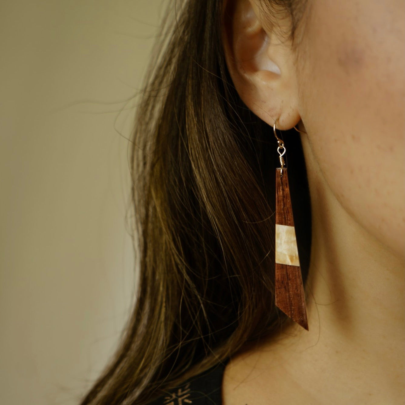 My original design, named for my hiapo (first born child) Kūpono. This is the design that started it all. This one is called Pono. I was always taught that the true meaning of pono meant balance. Hawaiians never believed in being right, they believed that when things were in balance, things were in harmony. From sadness emerges joy. From happiness comes devotion. From loss, new birth emerges. From weakness, we discover strength. The design of pono has a slight angle, which should be pointed towards your body to bring mana into your heart. These earrings are to bring inner resilience and balance to your life. The combination of two woods that compliment each other, our pono design is a beautiful, bold wearable masterpiece that strengthens your heart.